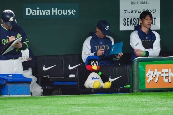 ヤクルトは巨人との開幕戦で、球団マスコット「つば九郎」のぬいぐるみも一緒にベンチ入りした。試合前練習から三塁側後列ベンチの隅っこでナインを見守った。